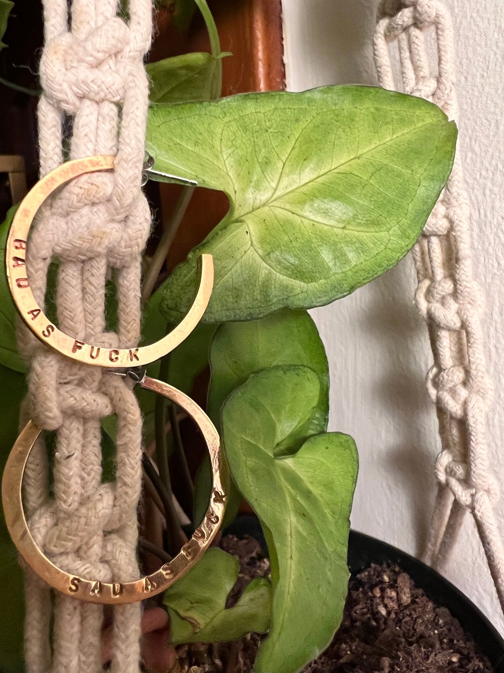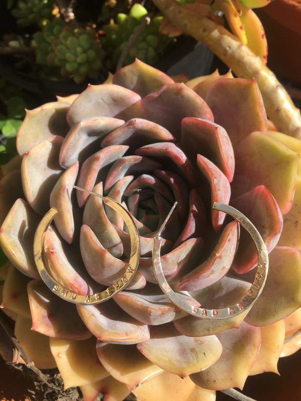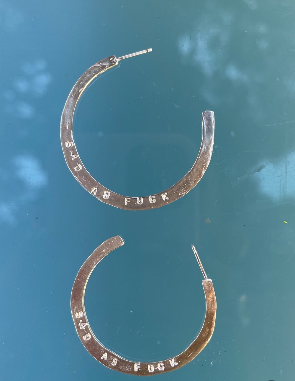 Stamped yellow bronze hoops with sterling silver posts to match your bad as fuck/sad as fuck days. Also available in sterling silver.