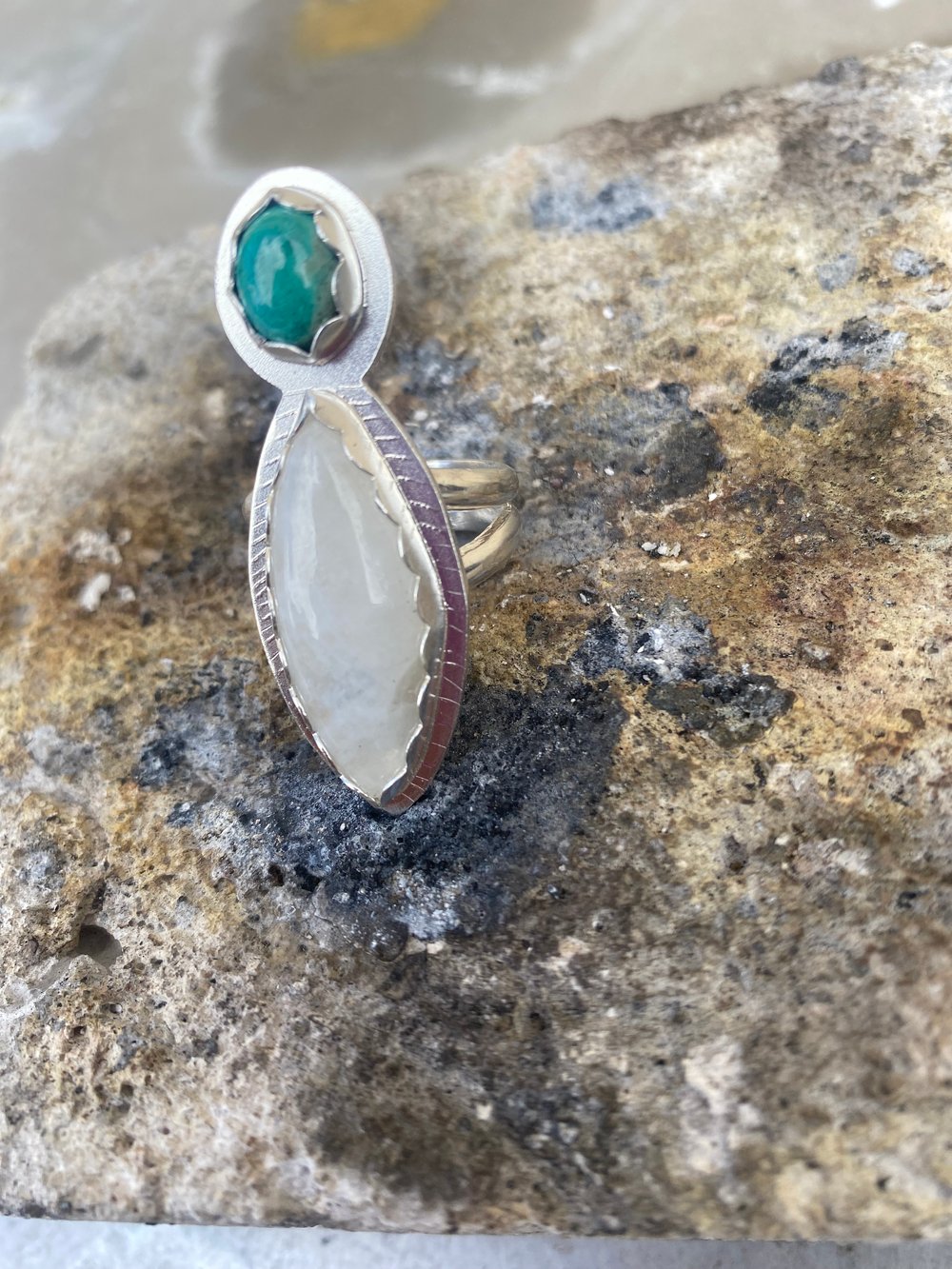 Chysacolla+ Moonstone+ sterling silver. Hand etched and hammered backplate and split shank band. size 8-8.25
