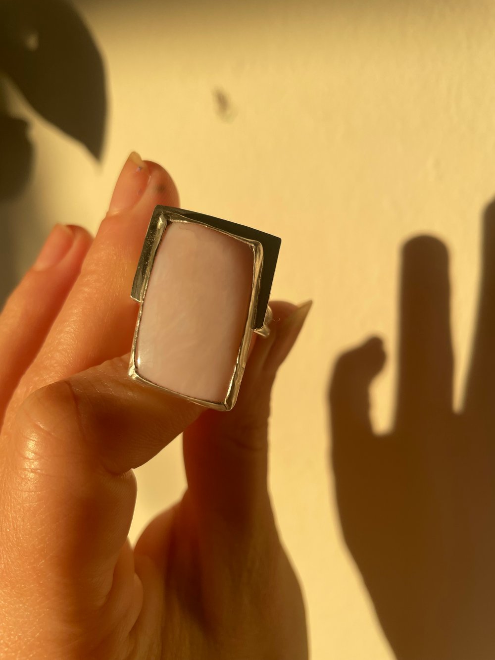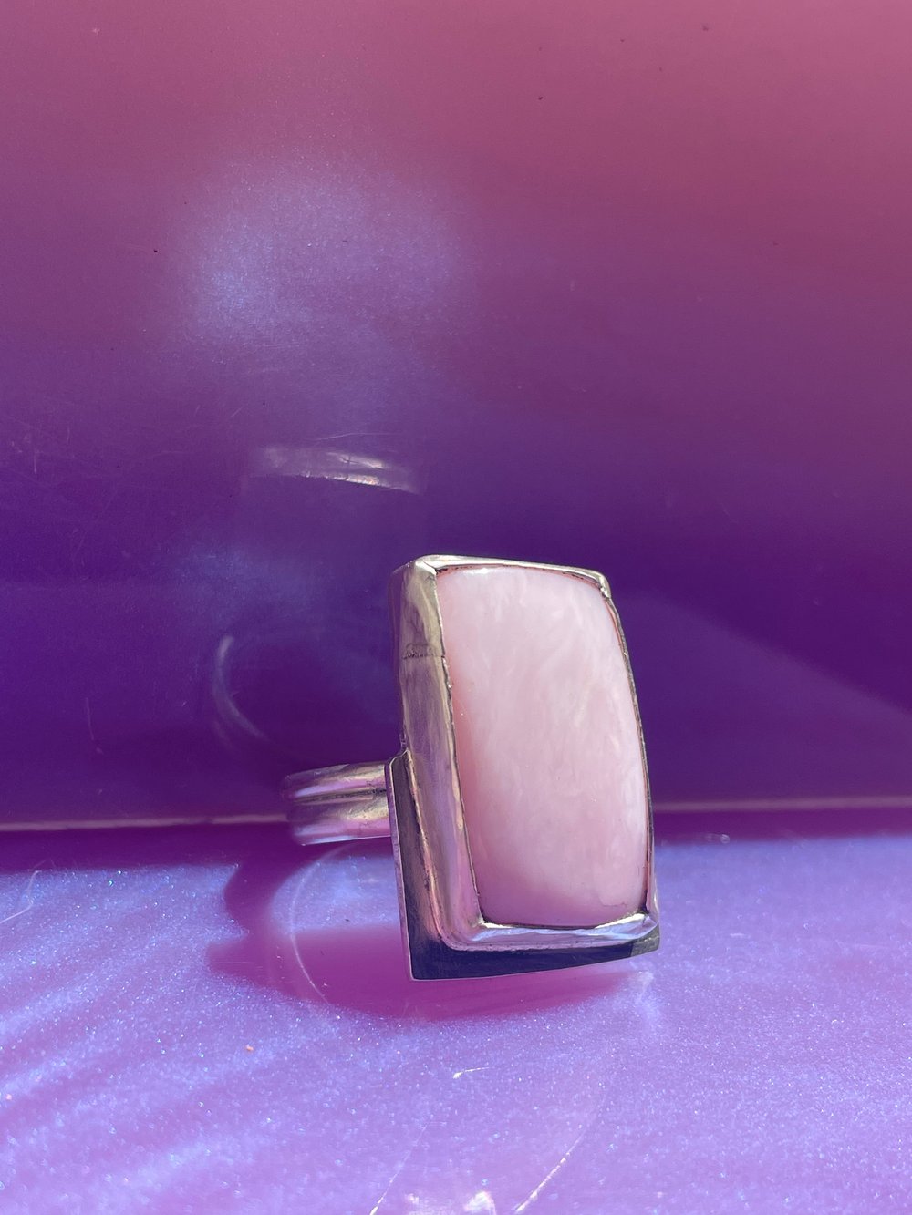 Pink Opal + Sterling silver. Double band w/slight overhang aka the shield. Size 8.75-9