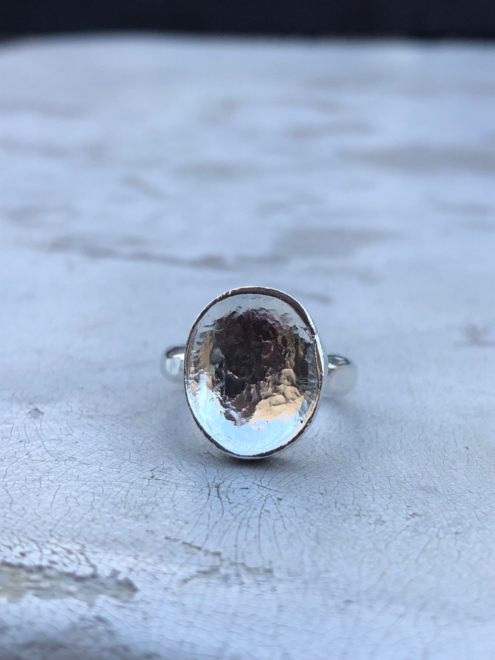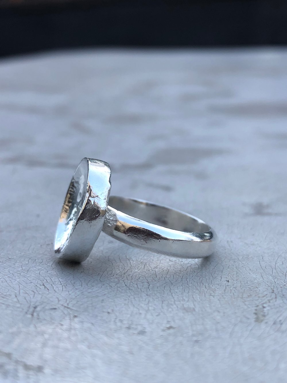 This was a happy accident. One day in the studio I was trying to solder a bezel to a back plate which wasn't working. I got frustrated and kept my torch on the bezel and melted it all together, which created this lil convex piece of silver that reminded me of a mirror. I decided to cast it and make rings with it and the rest is history! I wear this piece as a reminder that even when you're frustrated (in whatever aspect of your life) you can always use that to create unique and beautiful things <3
