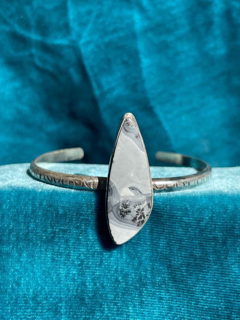 Maligano Jasper + Sterling Silver. Hand stamped with what looks like raindrops, giving it a fossilized PNW look.