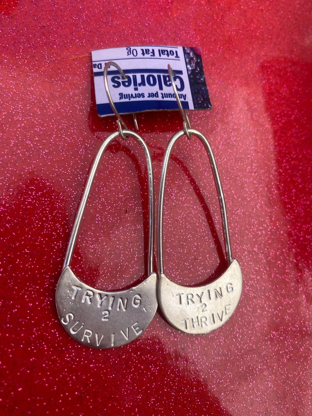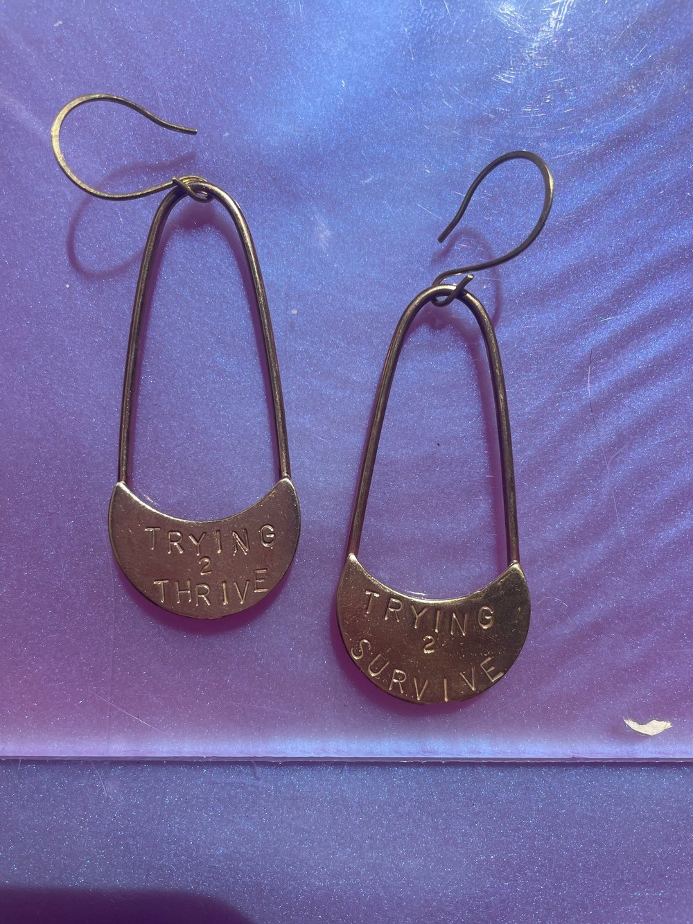 Hand stamped and casted yellow bronze, attached to hooks. Also available in sterling silver.